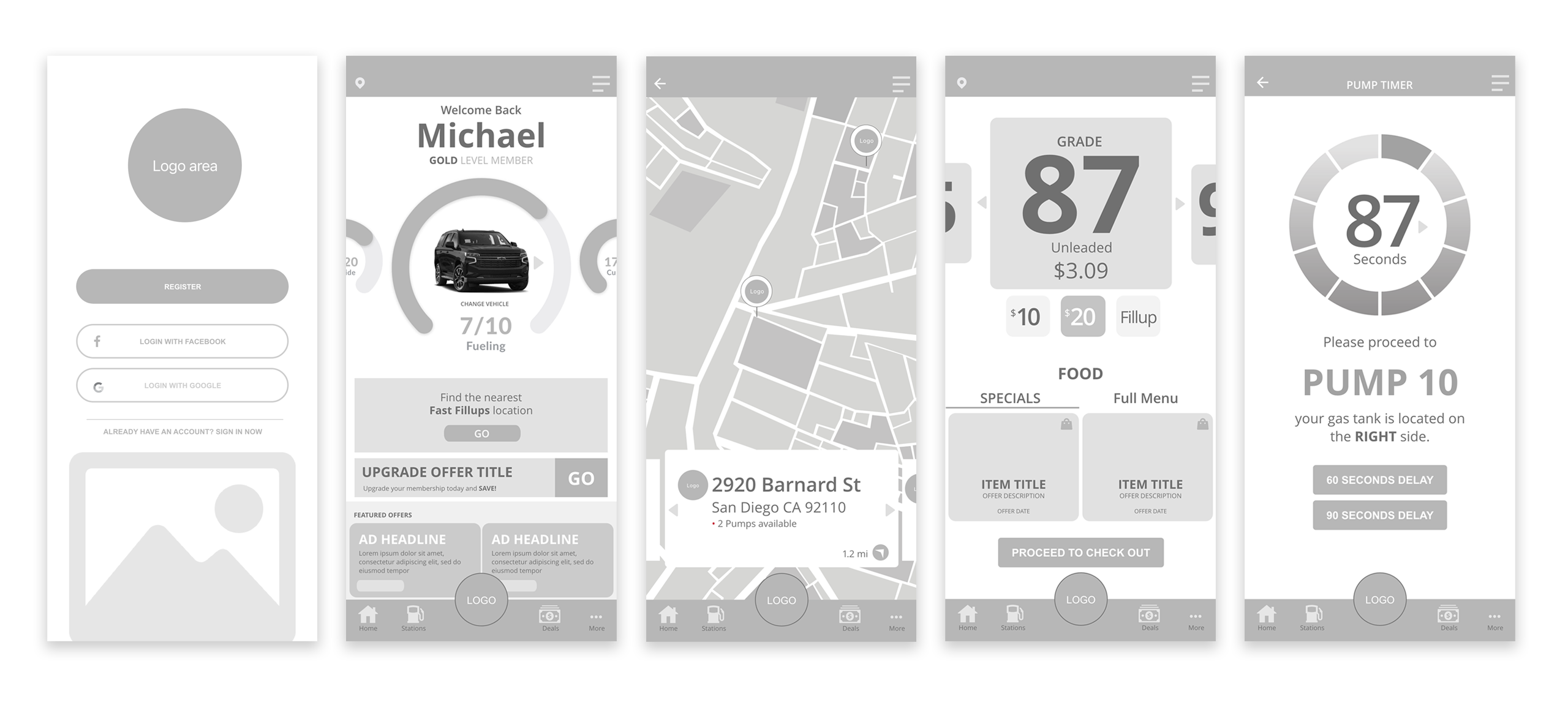 Before diving into design, we built a complete wireframe set to ensure the user experience was seamless from start to finish. The wireframes mapped out every core interaction—from logging in, to finding a nearby station, to ordering food or fuel, to completing payment—all designed to minimize taps and maximize clarity. By focusing on the journey first, we were able to stress-test logic, refine functionality, and speed up stakeholder alignment. The approved wireframes became our blueprint for both the UI and development teams, accelerating the transition from concept to production.