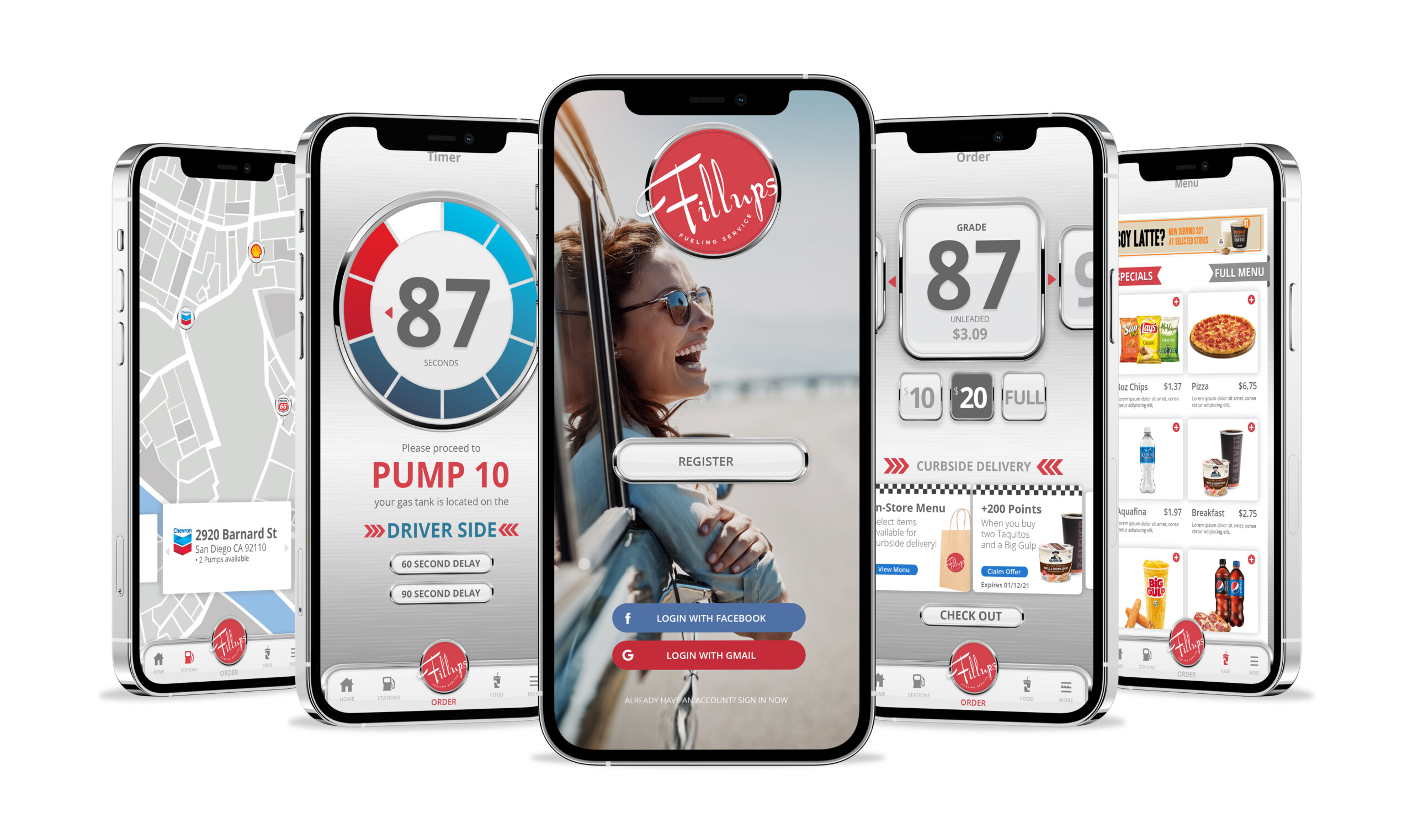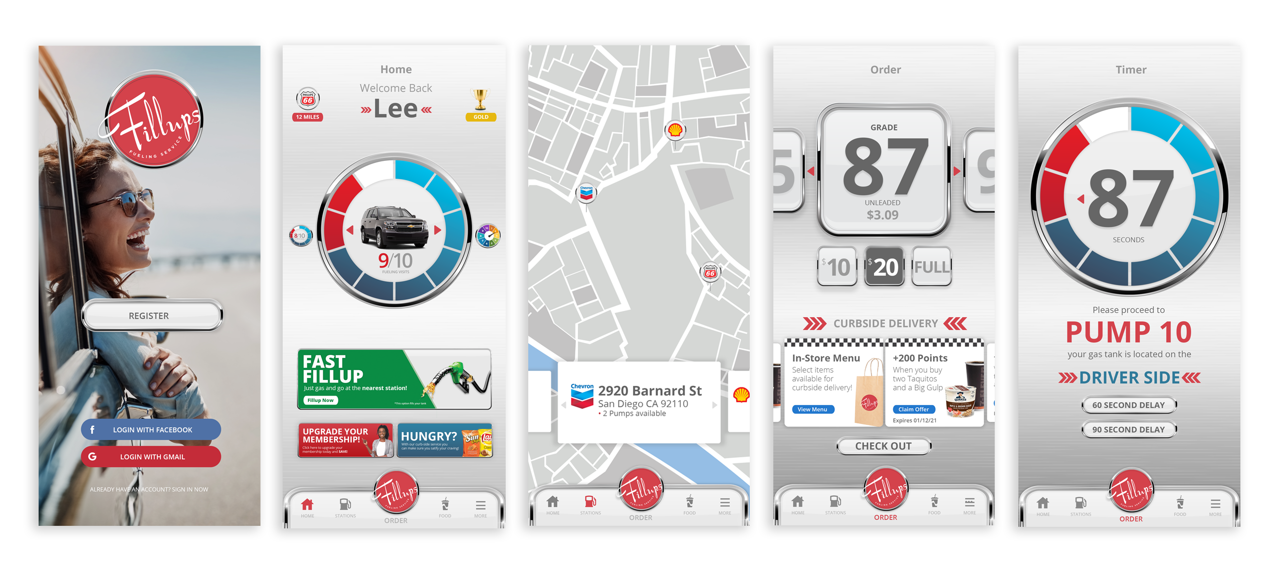 To capture the spirit of “the good old days,” our team crafted a series of mood boards that transported the client—and eventually the user—back to the golden era of full-service gas stations. Inspired by 1950s Americana, we curated visuals that blended bold chrome accents, checkered flooring patterns, retro typography, and a red-and-silver palette reminiscent of vintage signage and service uniforms. This nostalgic vibe became the cornerstone of the Fillups brand—striking a unique balance between modern convenience and classic charm. The result is an app experience that feels instantly familiar, friendly, and fun.